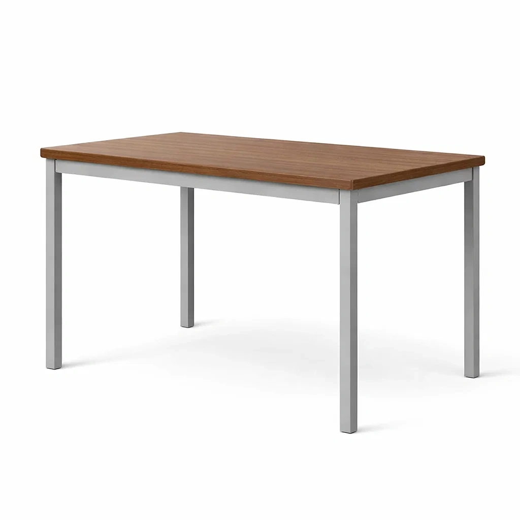 Il tavolo presenta un piano in legno con gambe in metallo. Dimensioni: lunghezza 120 cm, larghezza 60 cm, altezza 75 cm. Colore marrone per il piano e argento per le gambe. Peso totale: 20 kg. Struttura resistente e facile da pulire.