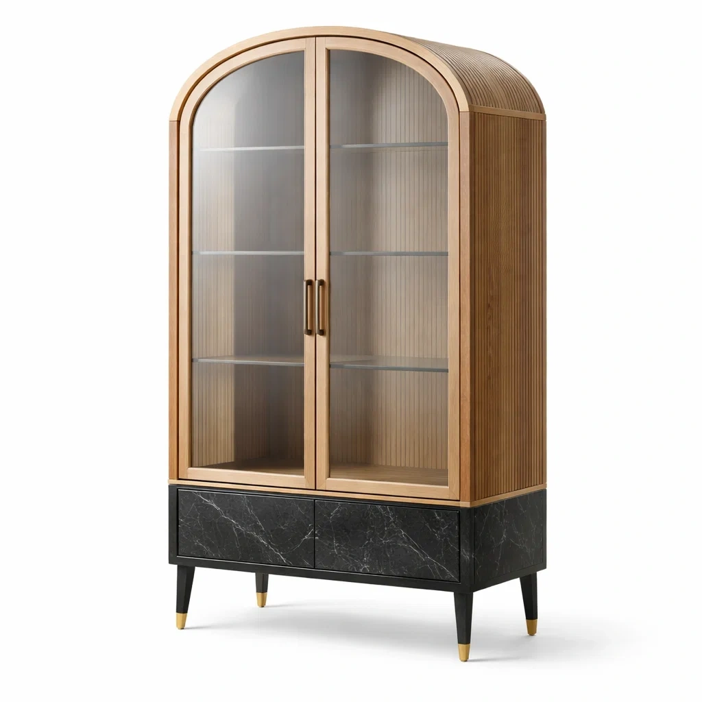 Vetrina in legno di quercia e vetro temperato con cassetti in mdf effetto marmo