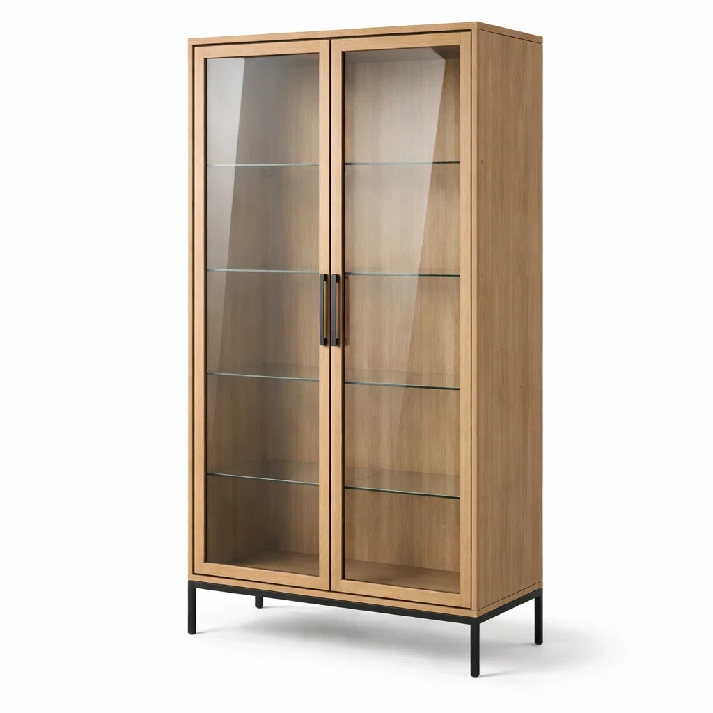 Questa vetrina è realizzata in rovere con ante in vetro temperato e una struttura in metallo nero per una maggiore stabilità.